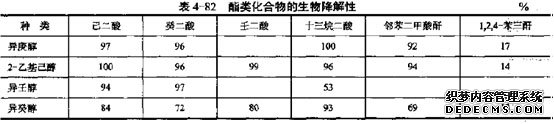 合成飽和酯的生物降解性與其化學(xué)結(jié)構(gòu)有很大關(guān)系。S.J.Kandles對不同結(jié)構(gòu)的酯類化合物的生物降解性進(jìn)行了研究,結(jié)果見表4-82。可以看出,由同種酸和不同鏈長的異構(gòu)醇反應(yīng)生成的酯類化合物,生物降解性隨支鏈醇相對分子質(zhì)量的增加而降低。由不同二元酸和同種醇反應(yīng)生成的酯,其生物降解性不隨酸相對分子質(zhì)量的增加而變化。在酯類化合物中,引入芳環(huán)會減弱生物降解性。總之,線性、非芳環(huán)和無支鏈的短鏈分子的生物降解性通常較好。由此看來,用作環(huán)境友好潤滑油基礎(chǔ)油的合成酯一般是雙酯、多元醇酯、復(fù)合酯和混合酯。