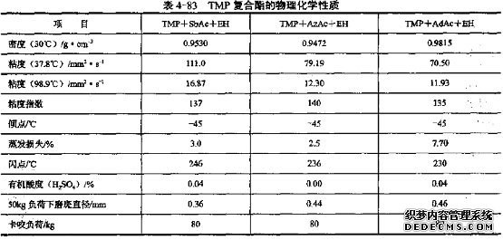 雙酯是由二元羧酸,如己二酸、壬二酸、癸二酸等與2-乙基己醇、異辛醇、壬醇、異癸醇等一元醇直接酯化而成;而多元醇酯是由新戊基多元醇與二元羧酸及一元醇經(jīng)過二步酯化而生成。用來合成多元醇酯的新戊基多元醇有新戊基二元醇、三羥甲基丙烷(TMP)、季戊四醇,二元羧酸有癸二酸(SbAc)、壬二酸(AzAc)和已二酸(AdAc),一元醇主要有2-乙基己醇(EH)、異辛醇、壬醇、異癸醇。TMP復(fù)合酯的理化性質(zhì)見表4-83。從表4-83可以看出,TMP復(fù)合酯具有較高的粘度指數(shù),較低的傾點(diǎn),較低的有機(jī)酸度,其閑點(diǎn)與粘度指數(shù)隨著二元酸碳鏈長度的增加而增加。